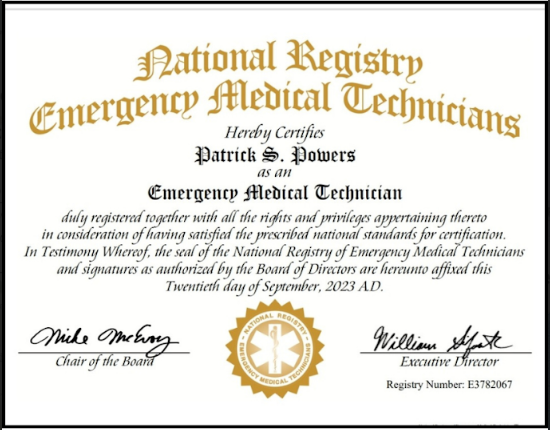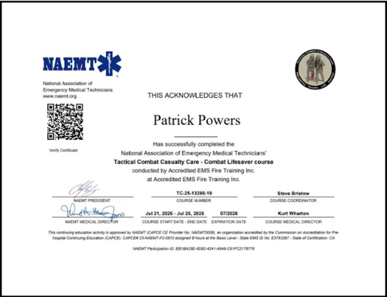 I have also since achieved my Gracie Survival Tactics Instructor Certification, and Emergency Medical Technician (EMT) Certification, which assist greatly in my work in providing emergency response, protection, and education to my community.